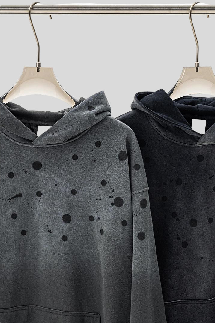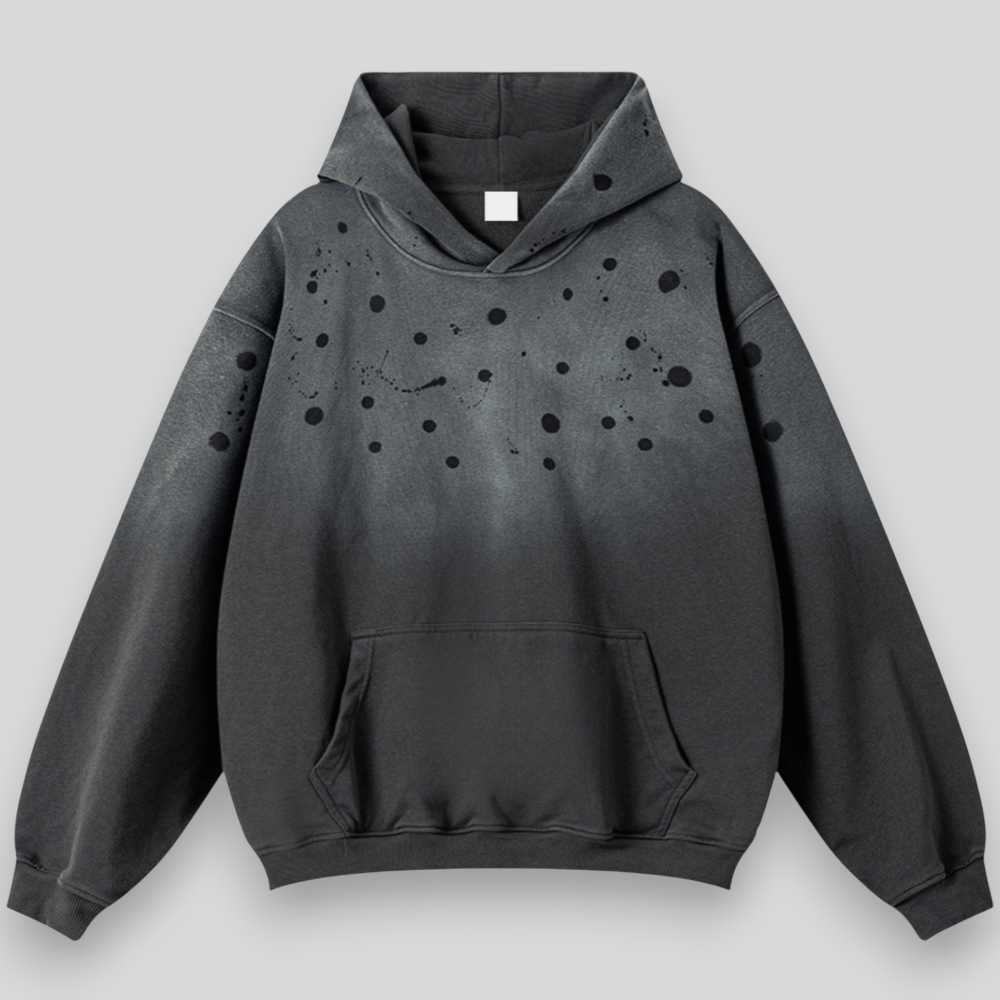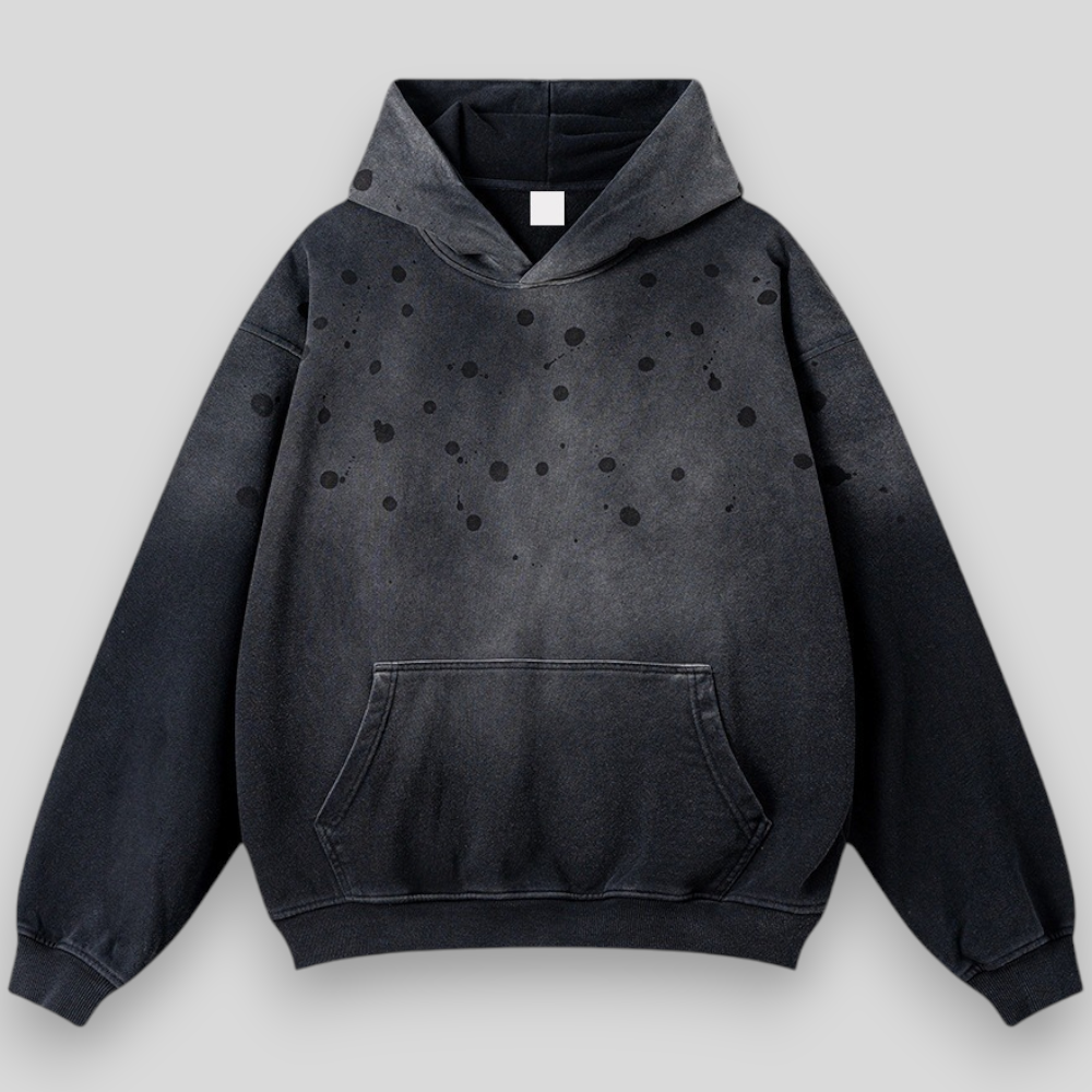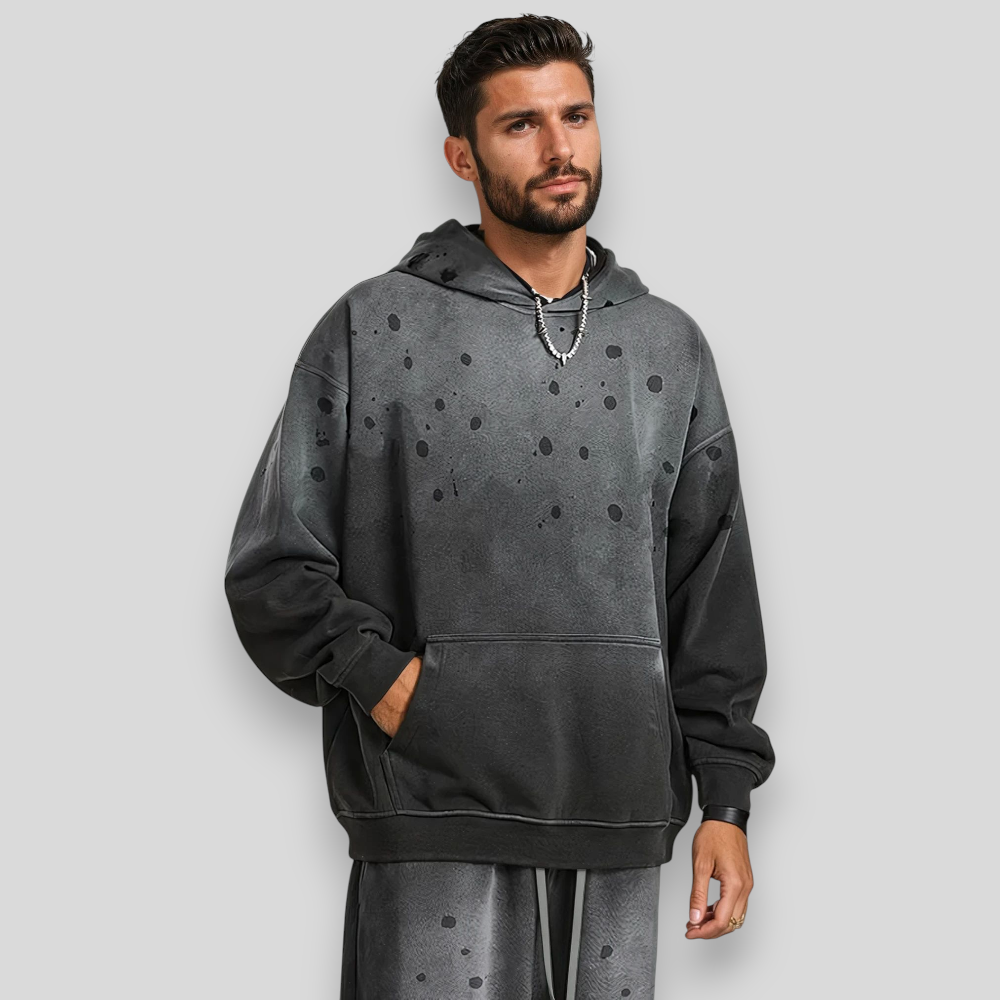 Wyrazista męska bluza z kapturem w stylu oversize to doskonały wybór dla fanów miejskiej mody i luźnych stylizacji. Wykonana w 100% z naturalnej bawełny, gwarantuje doskonały komfort noszenia, przewiewność i trwałość. Wzór z efektem nieregularnych plam i delikatnego cieniowania nadaje bluzie unikalnego, artystycznego charakteru. Klasyczna kieszeń typu kangurka oraz miękkie ściągacze zapewniają wygodę i praktyczność. Idealna do noszenia na co dzień – zarówno solo, jak i w komplecie ze spodniami w tym samym stylu.