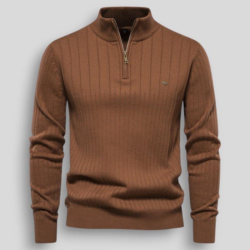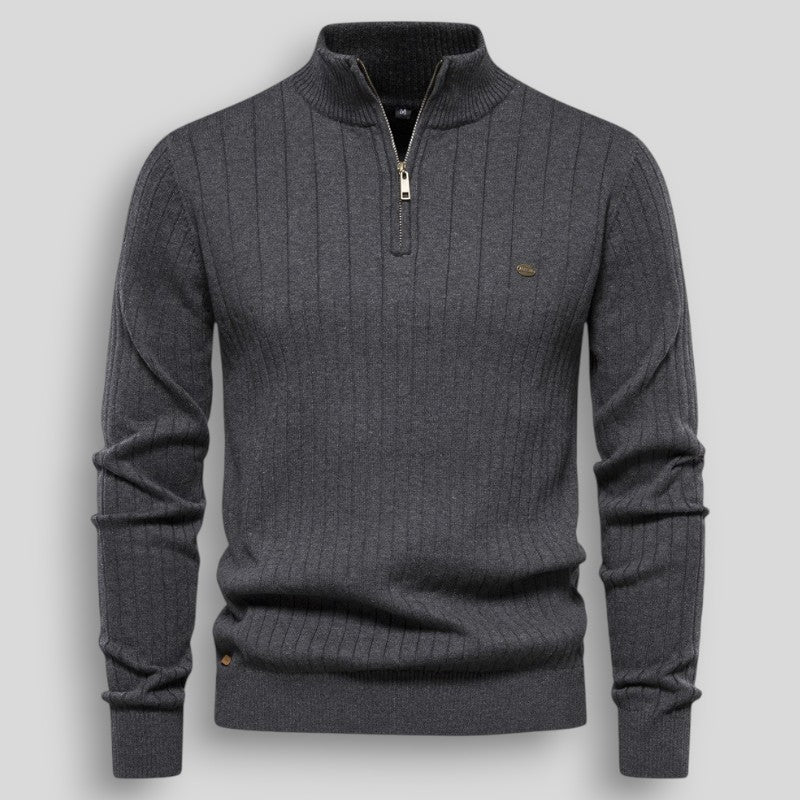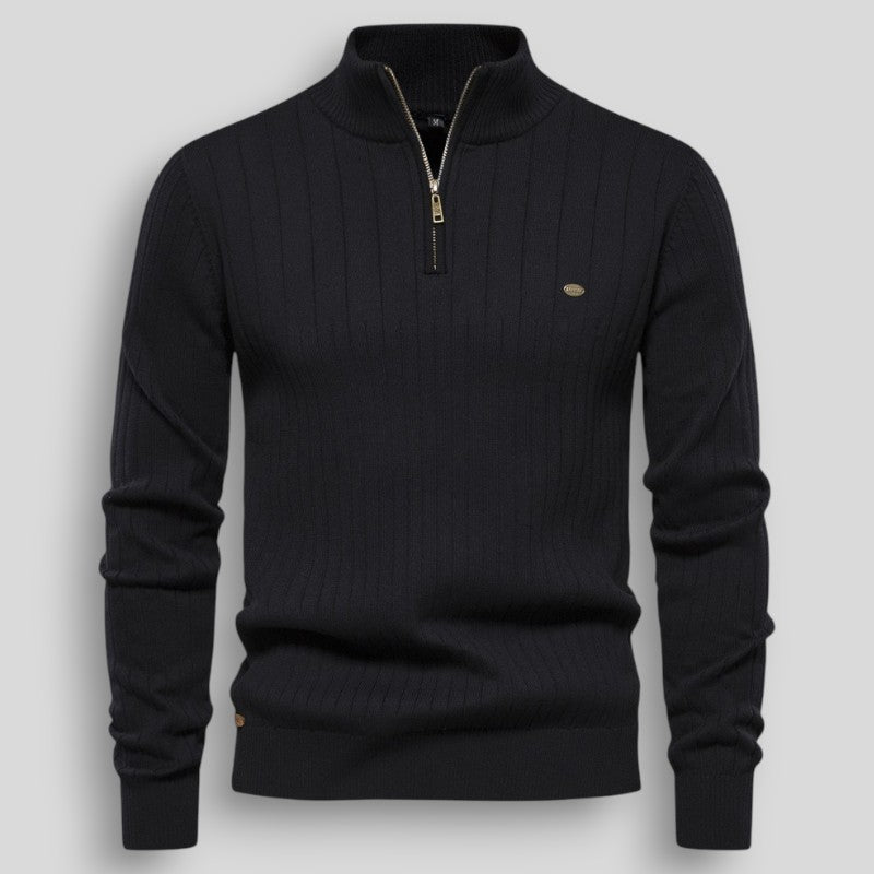 Stylowy męski sweter z prążkowanej dzianiny, zapinany pod szyją na krótki zamek. Doskonały wybór na chłodniejsze dni – łączy klasyczny wygląd z wygodą noszenia. Elastyczny materiał z dodatkiem lycry dopasowuje się do sylwetki i zapewnia swobodę ruchów. Sweter świetnie sprawdza się zarówno w codziennych stylizacjach, jak i w wersji smart casual – np. w połączeniu z koszulą. Idealny na co dzień, do pracy i na spotkania.