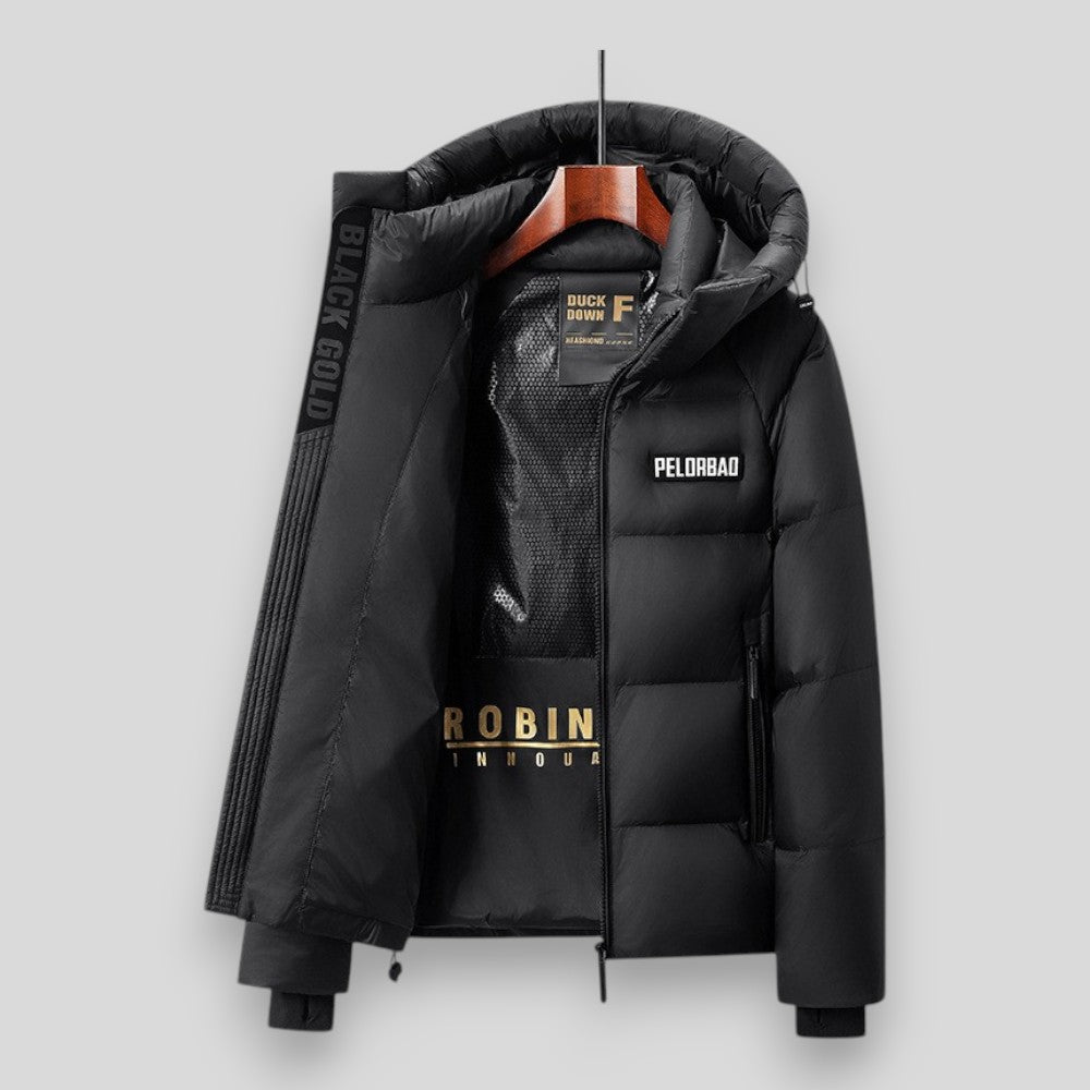 Męska kurtka zimowa z gęsim puchem i kapturem – pikowana, lekka i ciepła