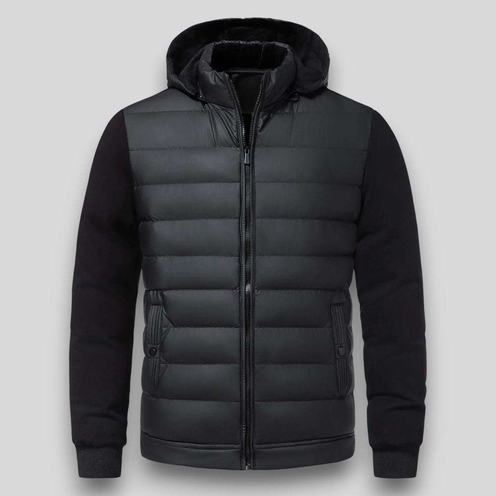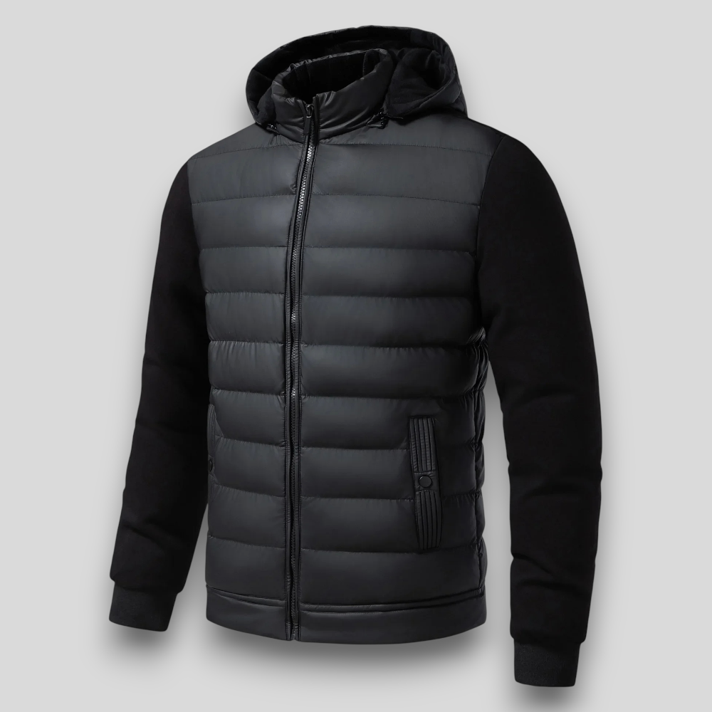 Męska kurtka pikowana z kapturem – ocieplana, casualowa, z rękawami z dzianiny