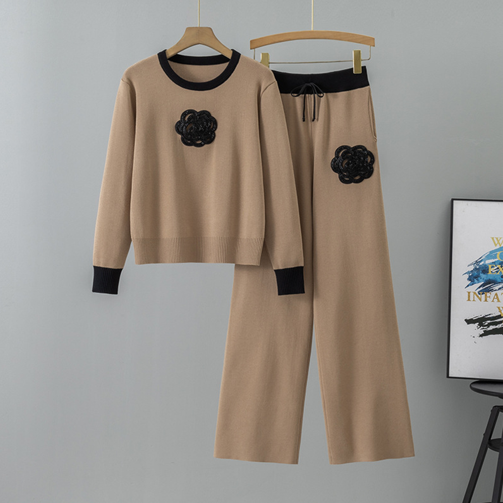 Damski komplet dzianinowy sweter + spodnie z aplikacją kwiatową – elegancki zestaw z kontrastowymi detalami