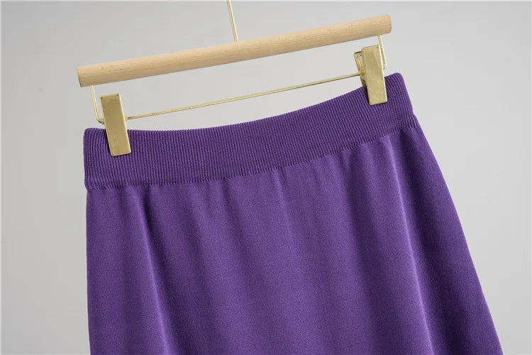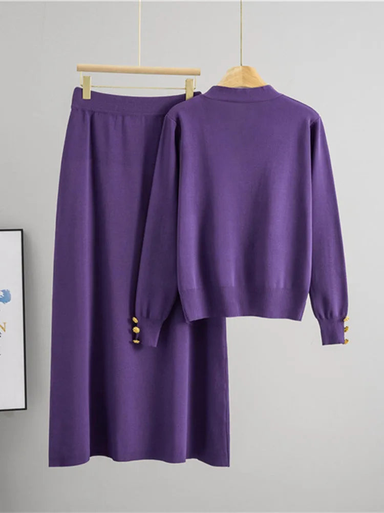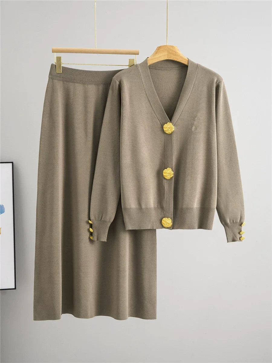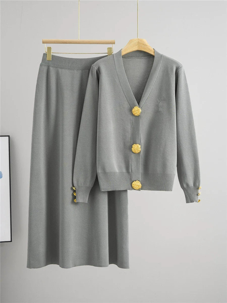 Damski komplet dzianinowy kardigan + spódnica midi – elegancki zestaw z ozdobnymi guzikami