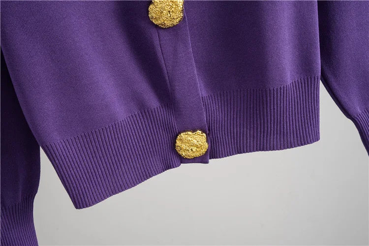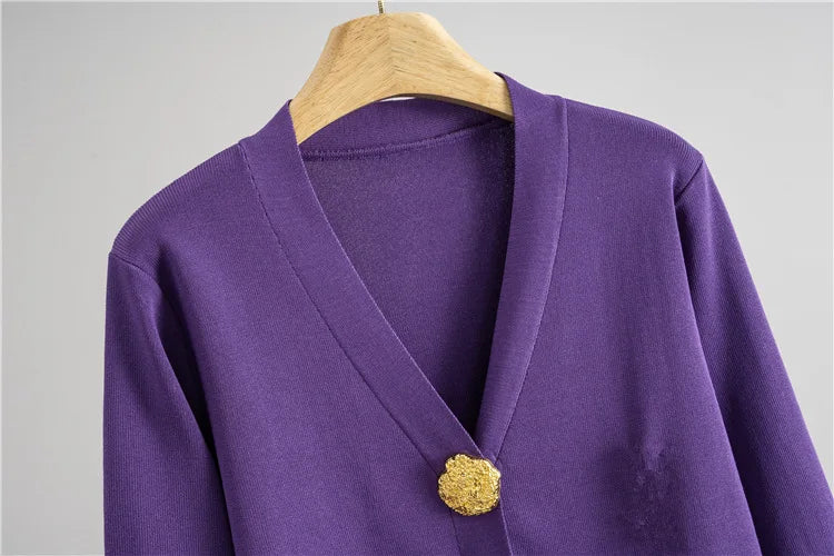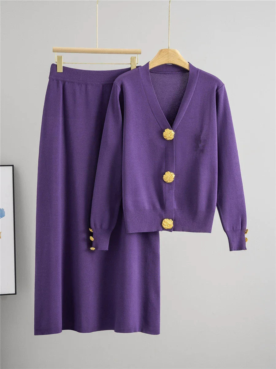 Ten szykowny komplet dzianinowy to doskonała propozycja dla kobiet ceniących klasyczną elegancję i wygodę. Zestaw składa się z miękkiego kardiganu z dekoltem w serek i dużymi, złotymi guzikami oraz spódnicy midi o prostym kroju z elastyczną talią. Złote detale na przodzie i mankietach dodają całości wyrafinowanego charakteru, czyniąc ten zestaw idealnym wyborem na spotkania, do pracy czy stylizacje typu smart casual.