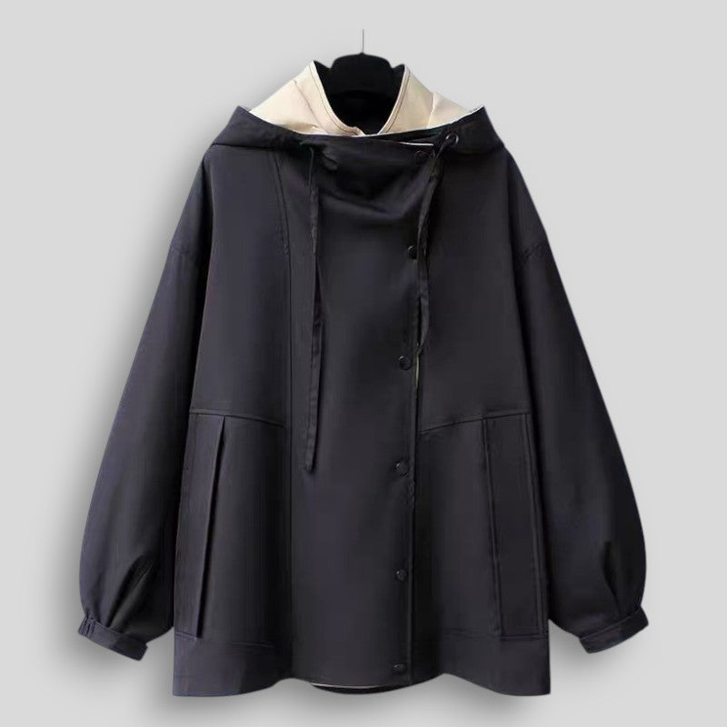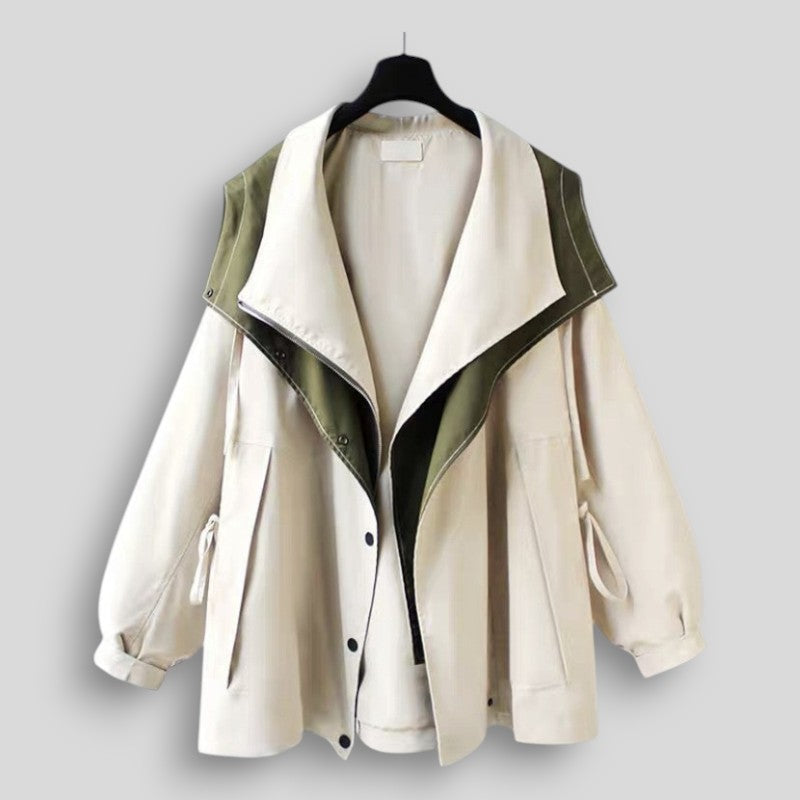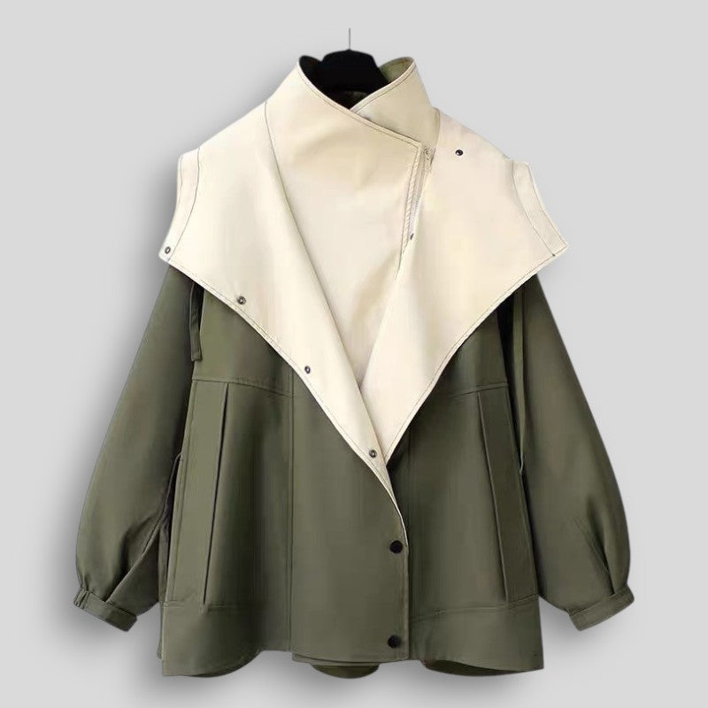 Nowoczesna damska kurtka z szerokim kołnierzem i kontrastowym panelem to wyrazisty element garderoby dla kobiet ceniących oryginalny styl. Obszerny fason zapewnia swobodę ruchów, a miękka tkanina dobrze układa się na sylwetce. Zamek i zatrzaski pozwalają na wygodne dopasowanie, a bufiaste rękawy nadają całości modowego charakteru. Idealna na przejściowy sezon i codzienne stylizacje z pazurem.