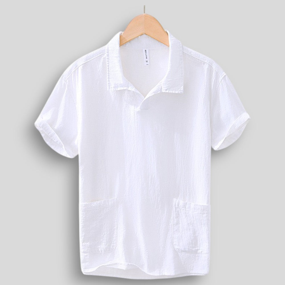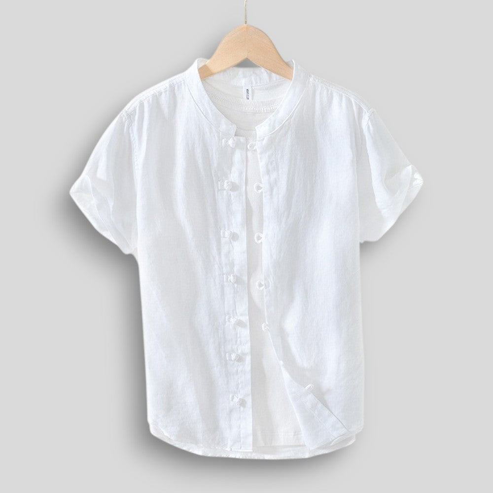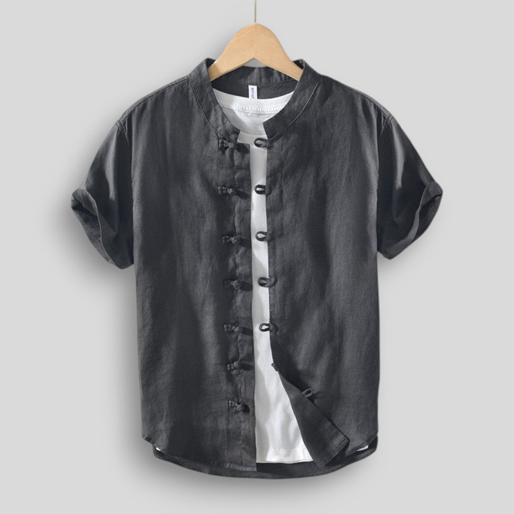 Lniana koszula męska z krótkim rękawem i tradycyjnym zapięciem – styl inspirowany Orientem