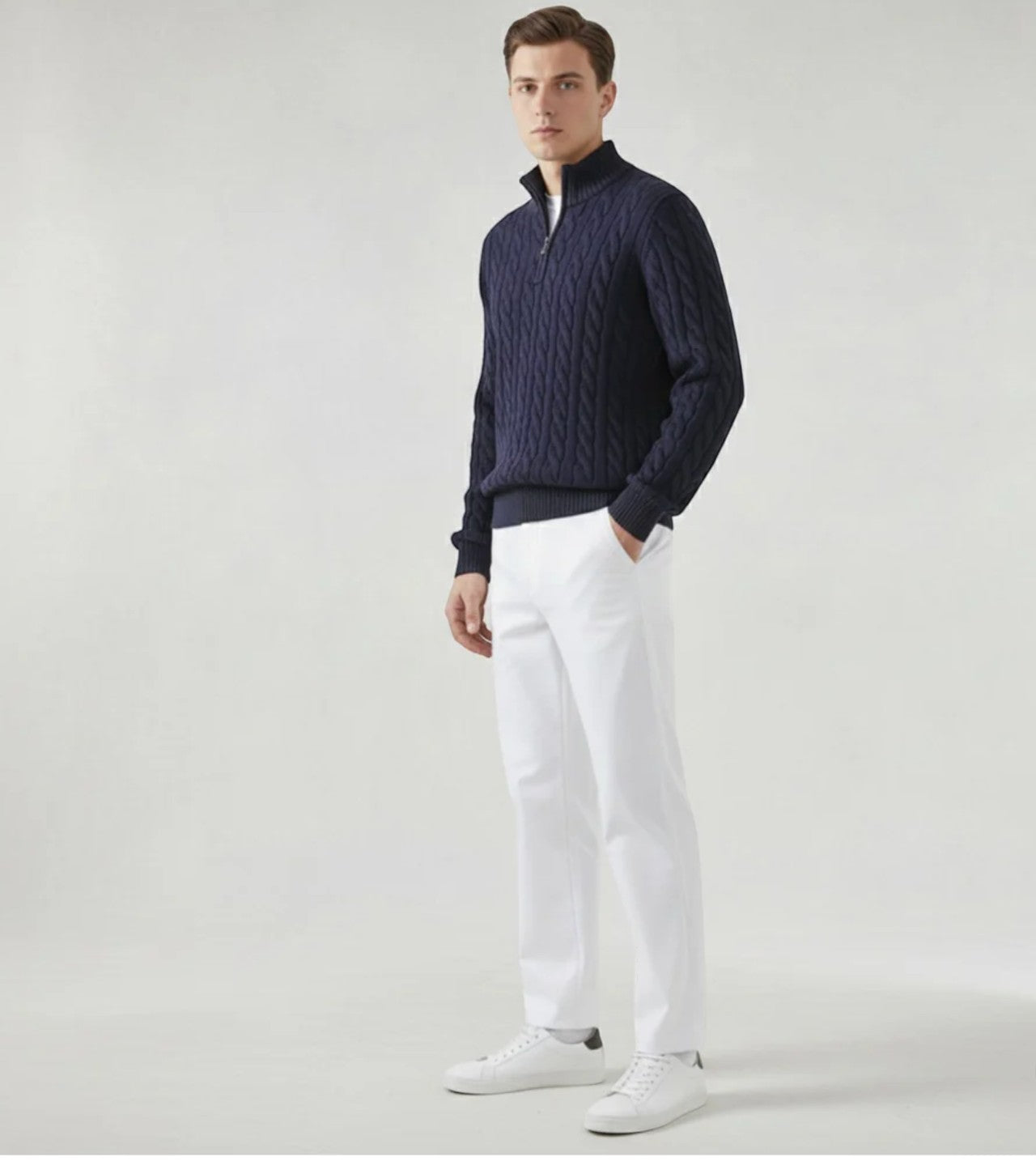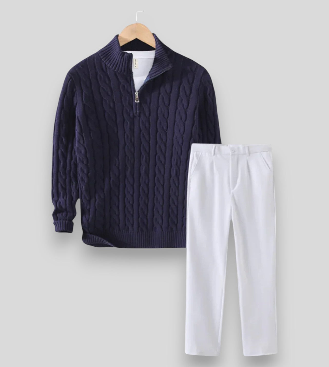 Postaw na elegancję i wygodę w jednym dzięki stylowemu zestawowi męskiemu, który doskonale sprawdzi się zarówno na co dzień, jak i podczas bardziej formalnych okazji. Połączenie klasycznego swetra z zamkiem oraz eleganckich spodni tworzy nowoczesny, dopracowany look.