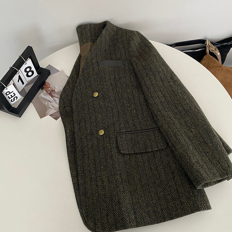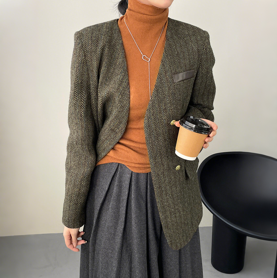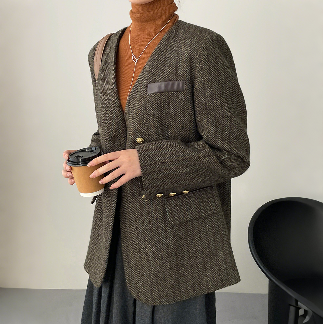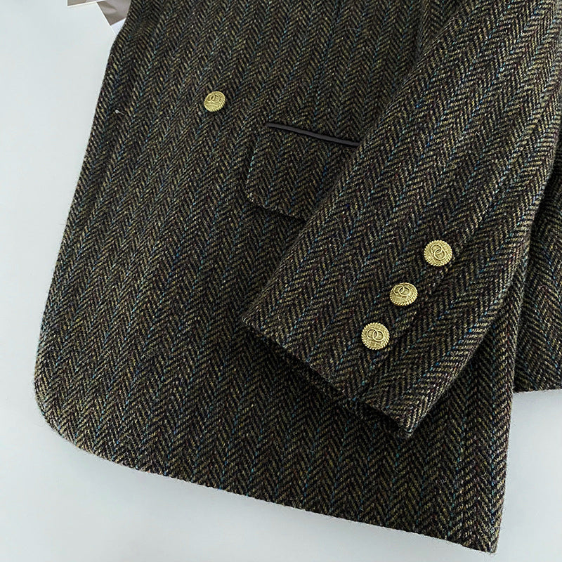 Damska marynarka wełniana w jodełkę z podwójnym zapięciem – elegancja w stylu vintage
