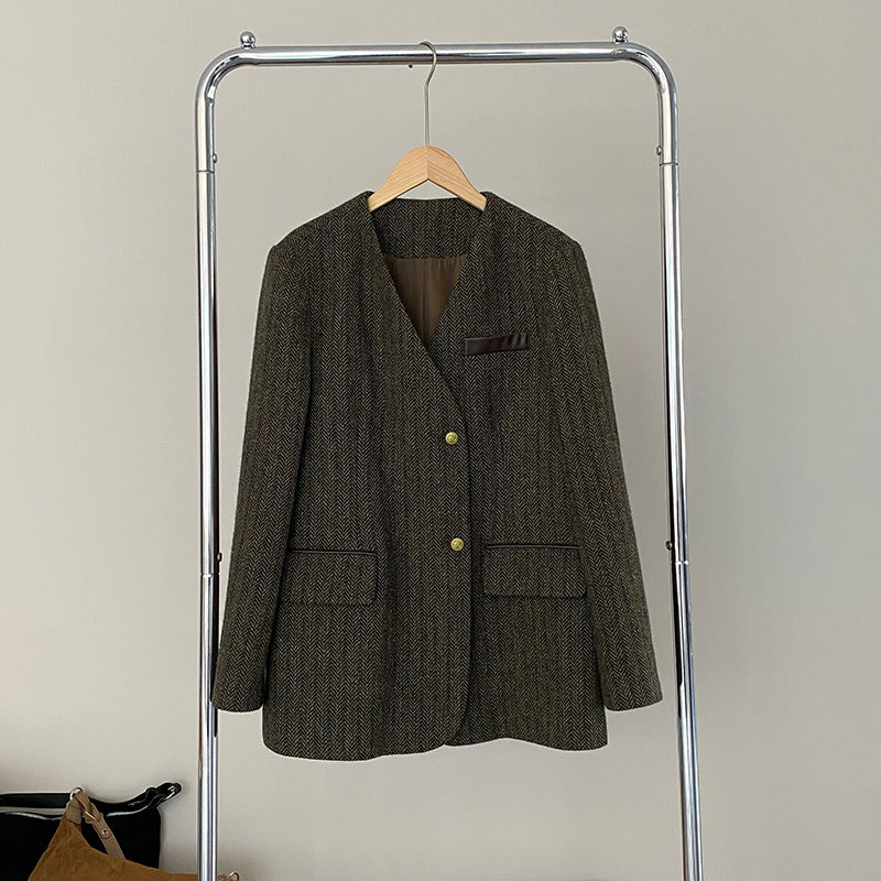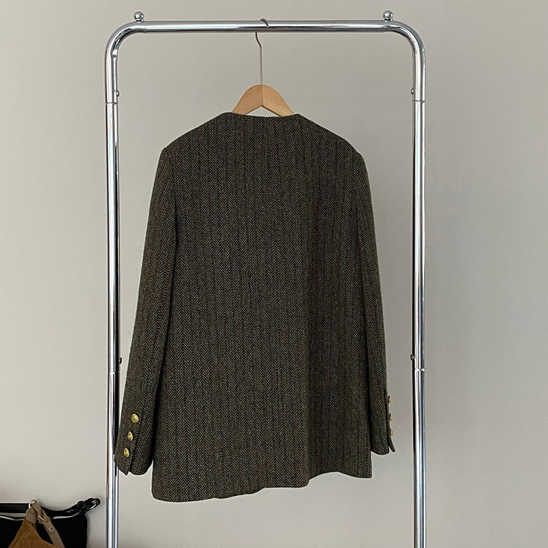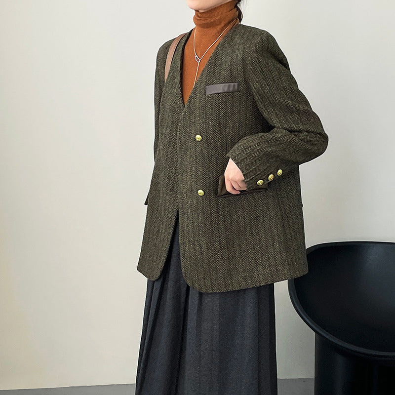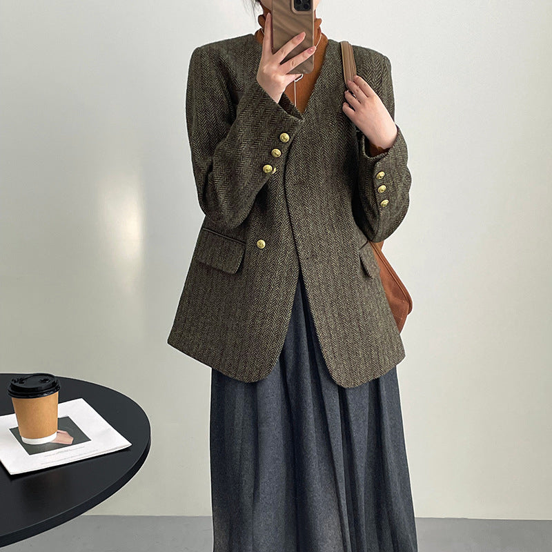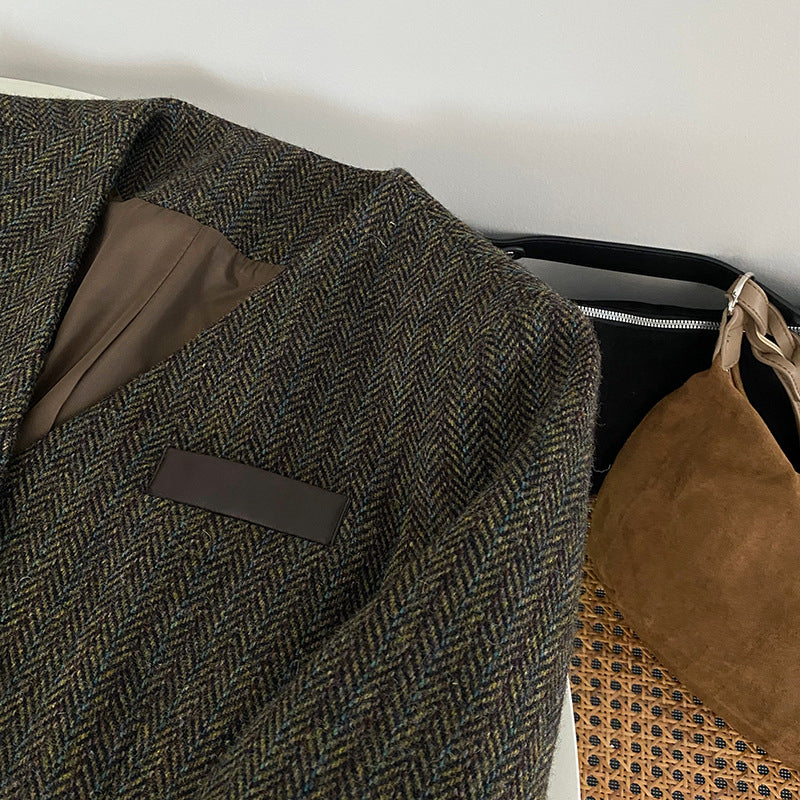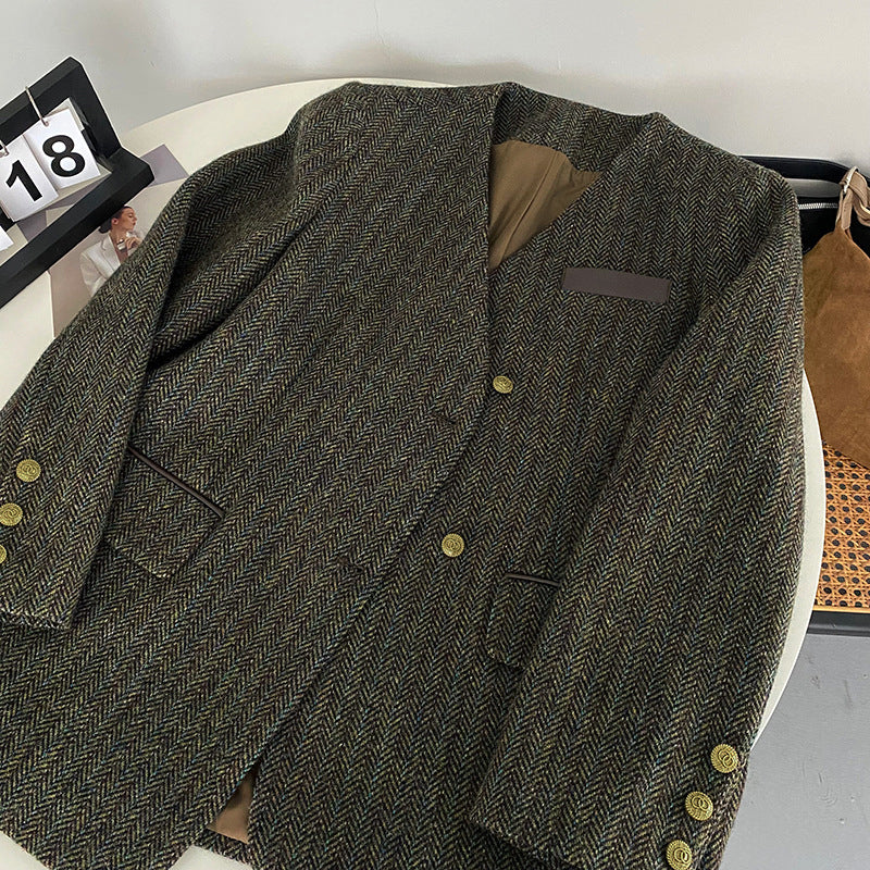 Damska marynarka wełniana w jodełkę z podwójnym zapięciem – elegancja w stylu vintage
