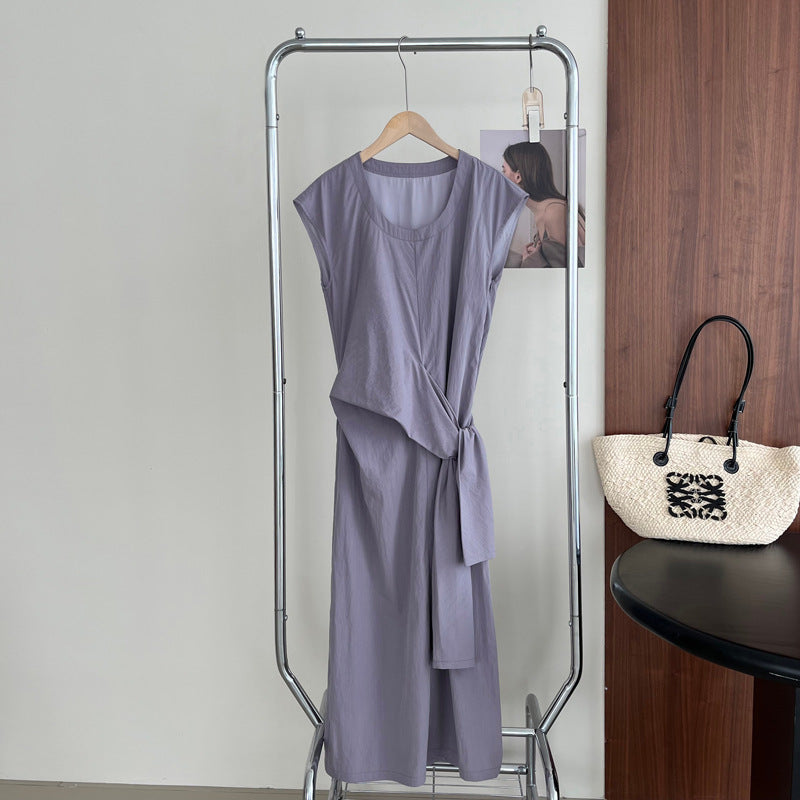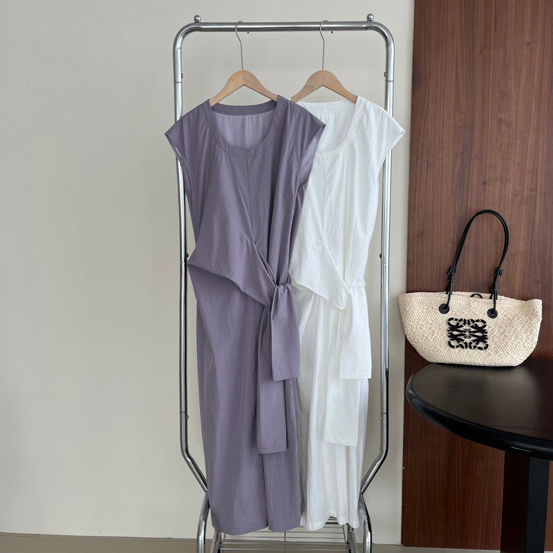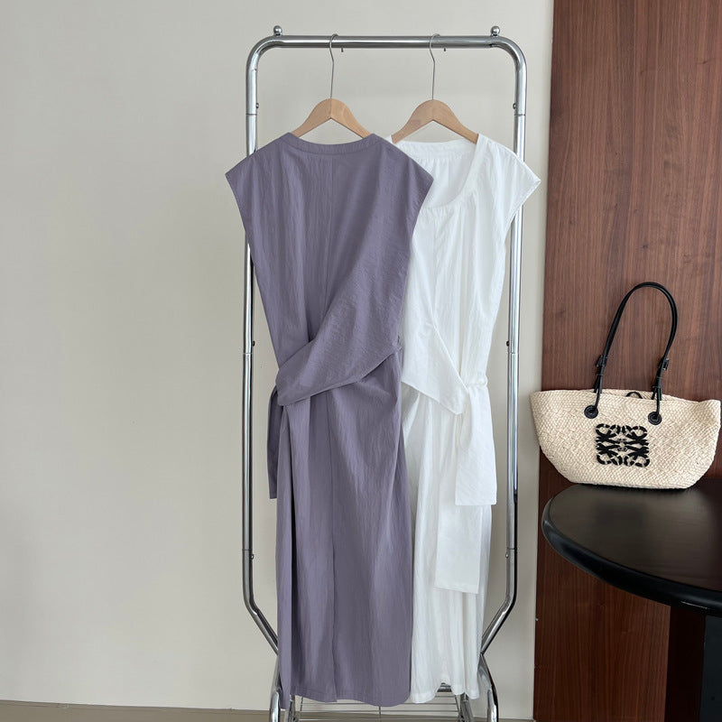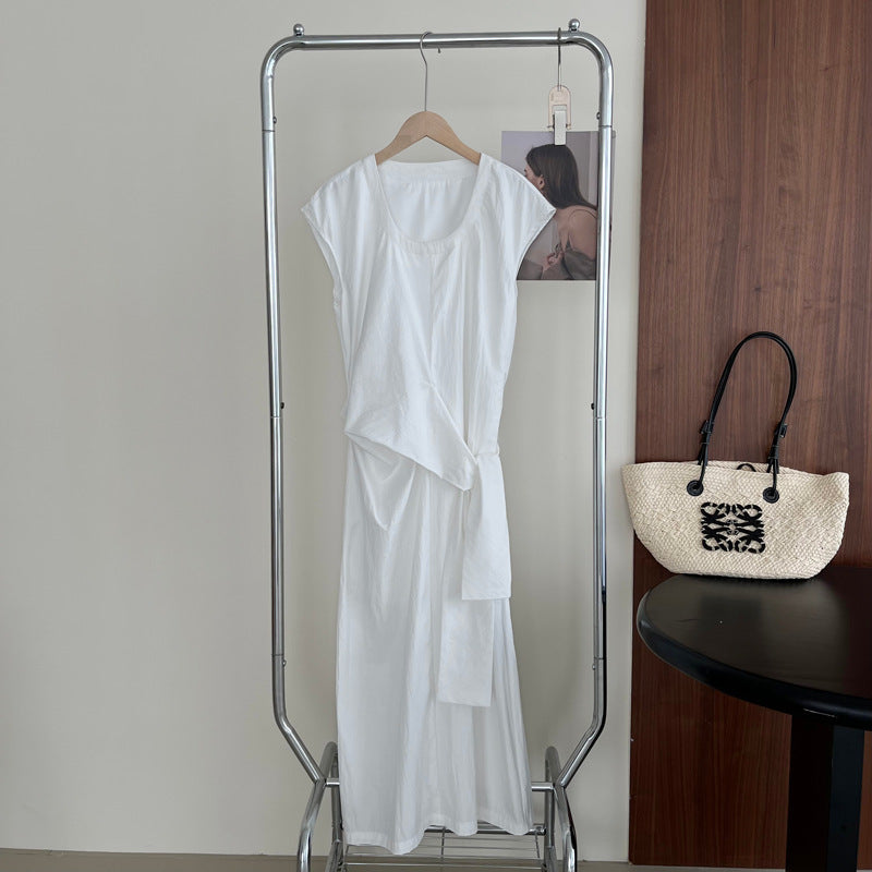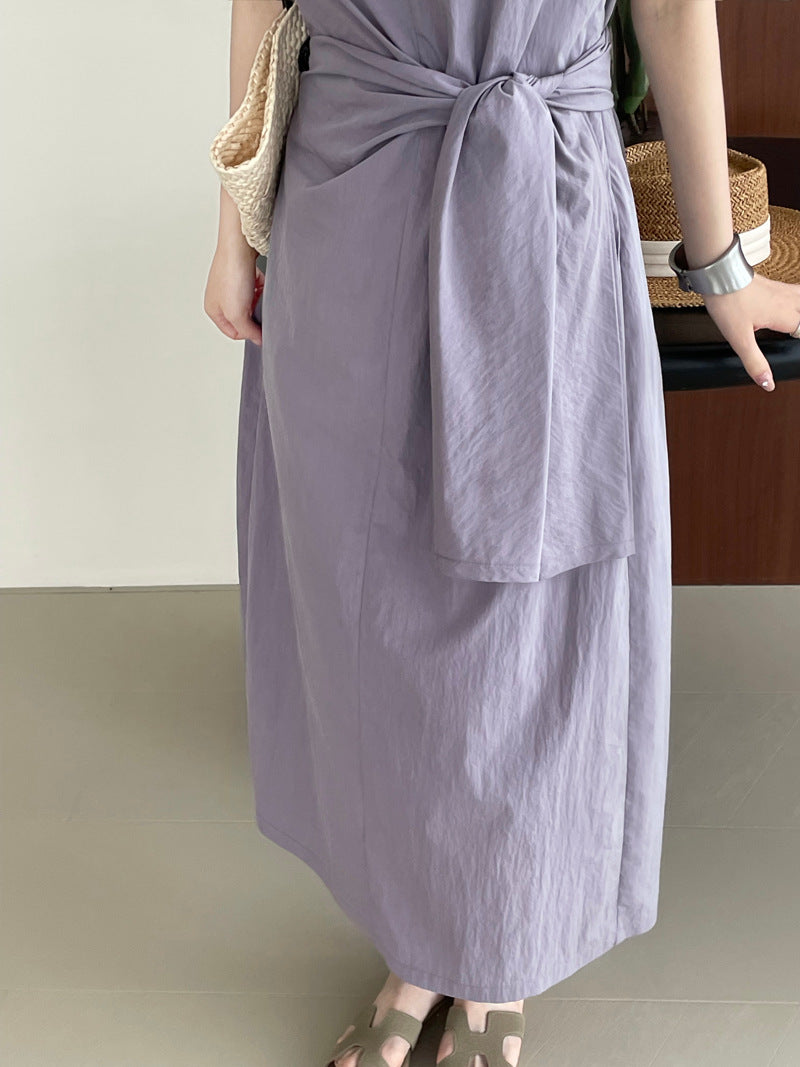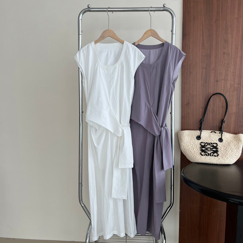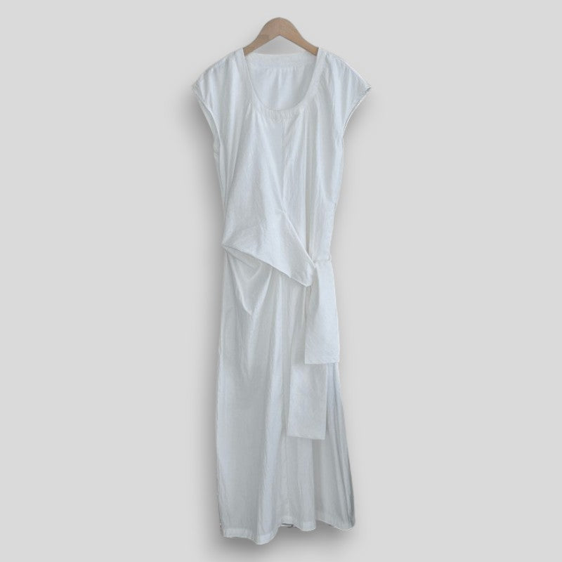 Długa sukienka z asymetrycznym wiązaniem w talii – elegancka i minimalistyczna