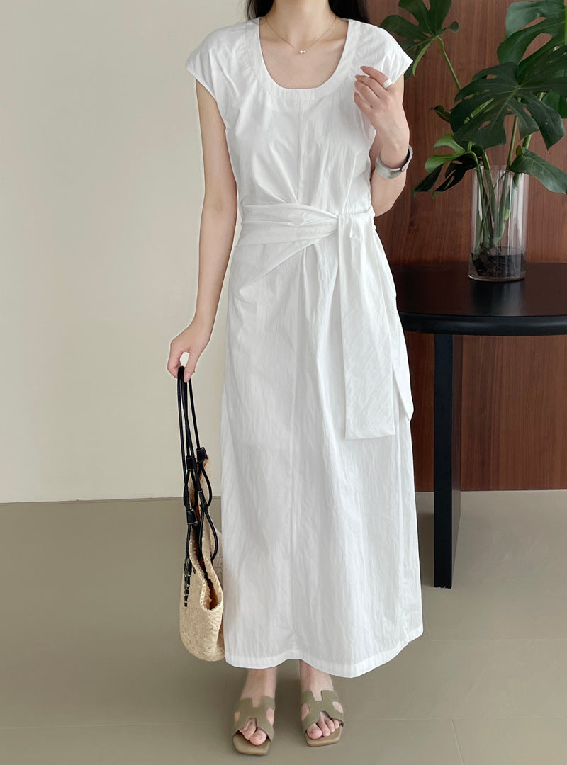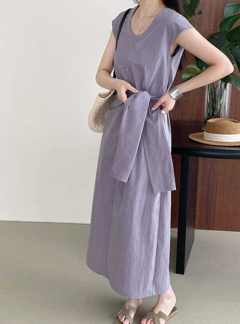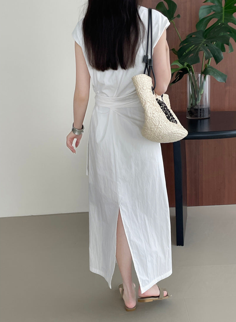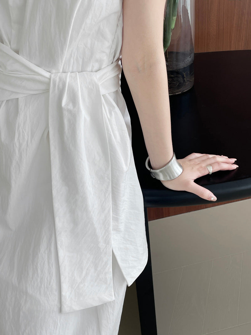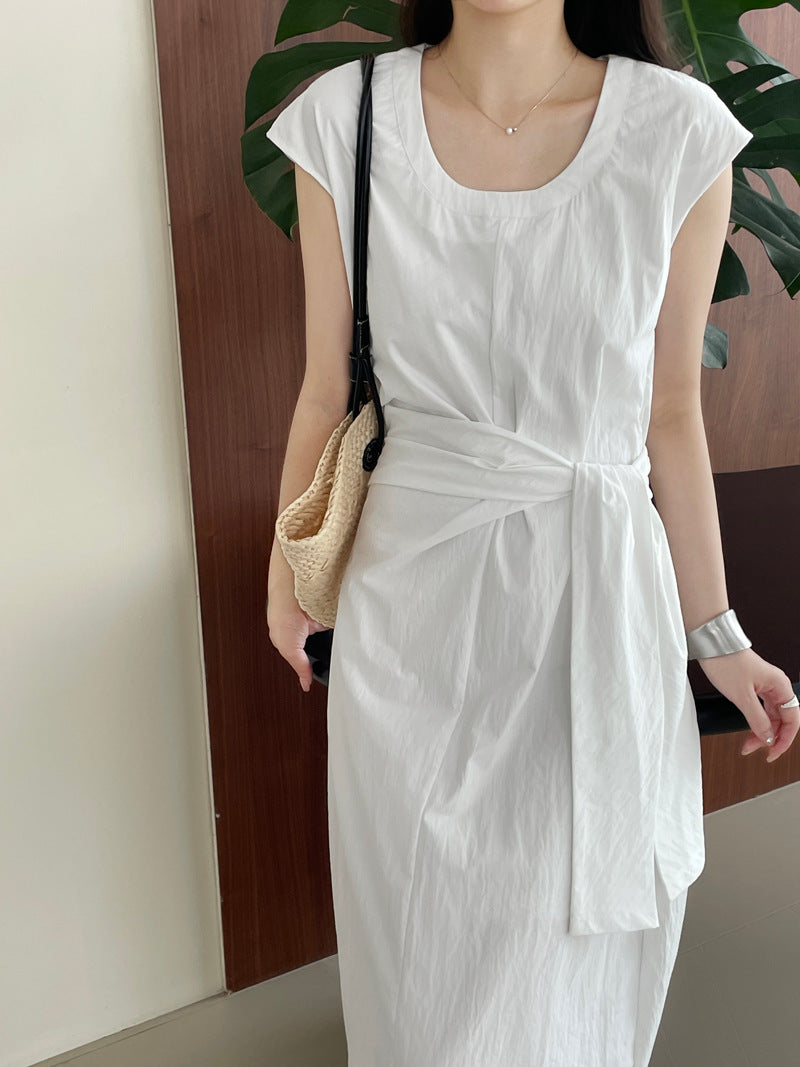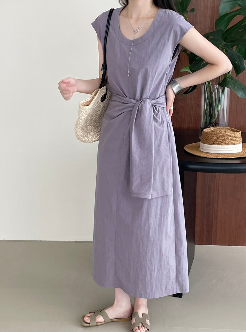Długa sukienka z asymetrycznym wiązaniem w talii – elegancka i minimalistyczna