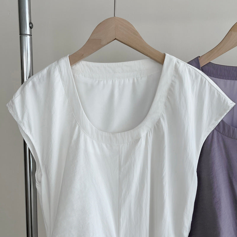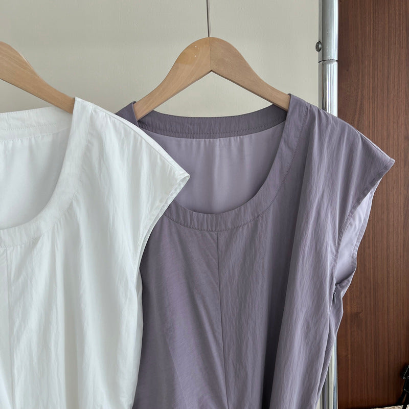 Stylowa długa sukienka o prostym kroju z delikatnie zaokrąglonym dekoltem i subtelnym rękawkiem cap sleeve to idealna propozycja na lato, urlop lub okazje wymagające lekkiej elegancji. Jej wyjątkowym akcentem jest asymetryczne wiązanie w talii, które podkreśla sylwetkę i dodaje oryginalności. Zwiewny, gładki materiał doskonale układa się na ciele, zapewniając wygodę i swobodę ruchów. Sukienka świetnie sprawdzi się zarówno z sandałami, jak i w bardziej szykownych stylizacjach.