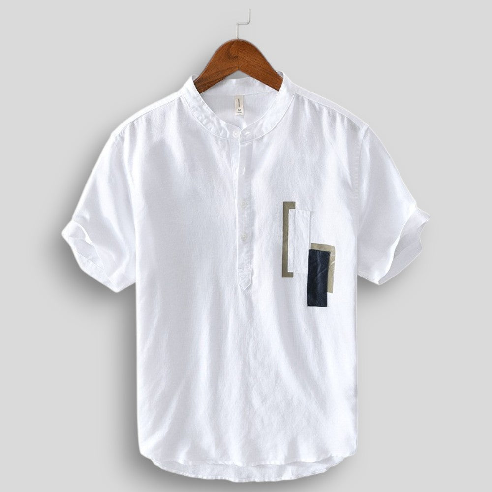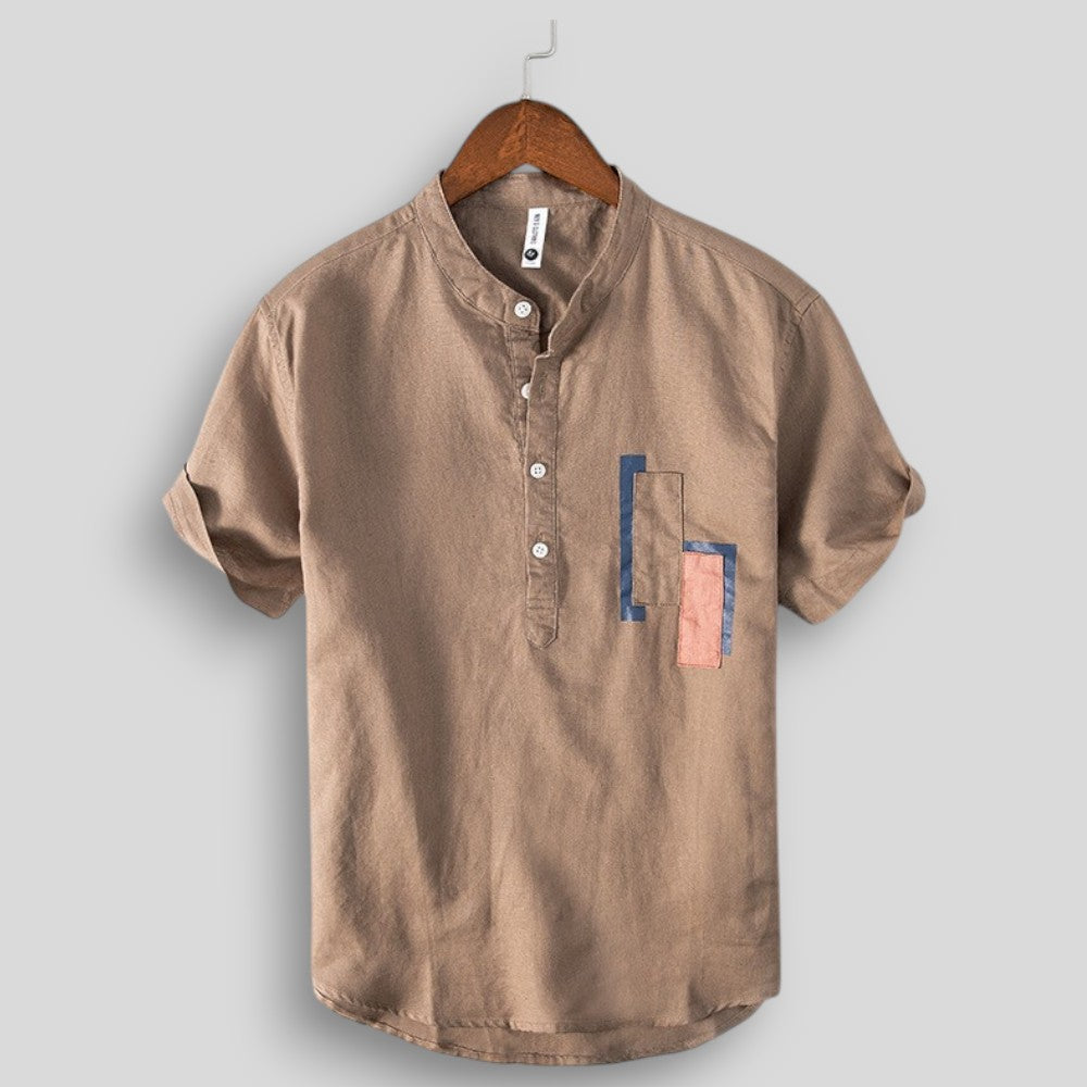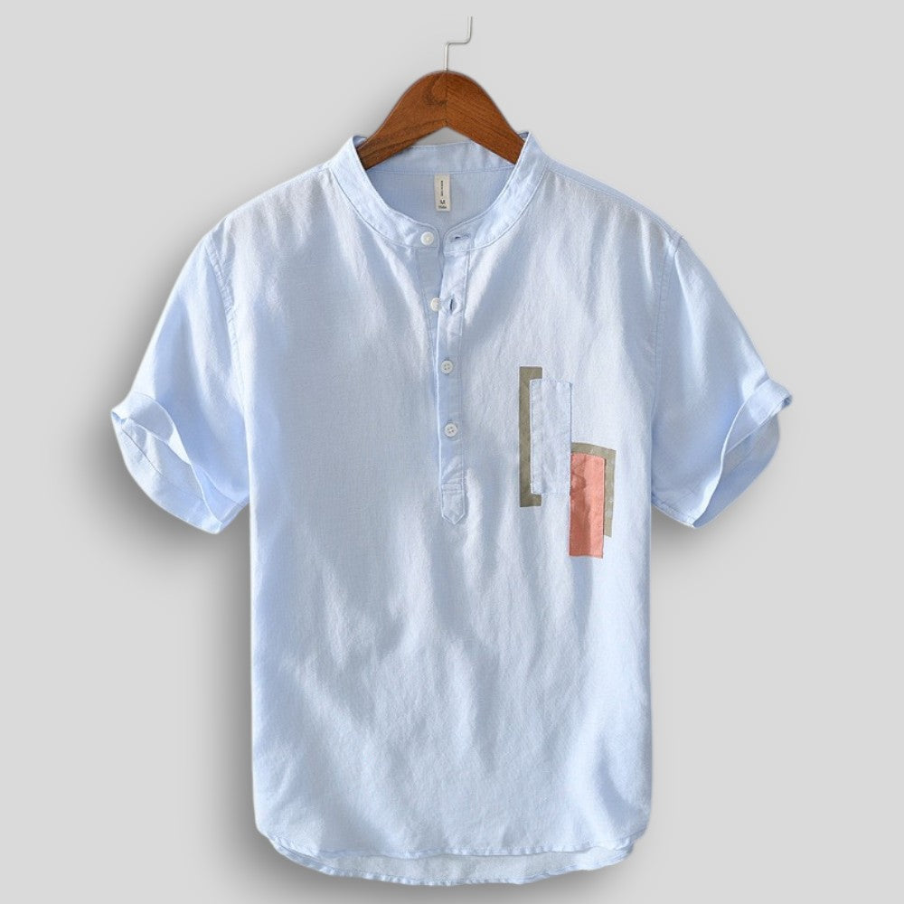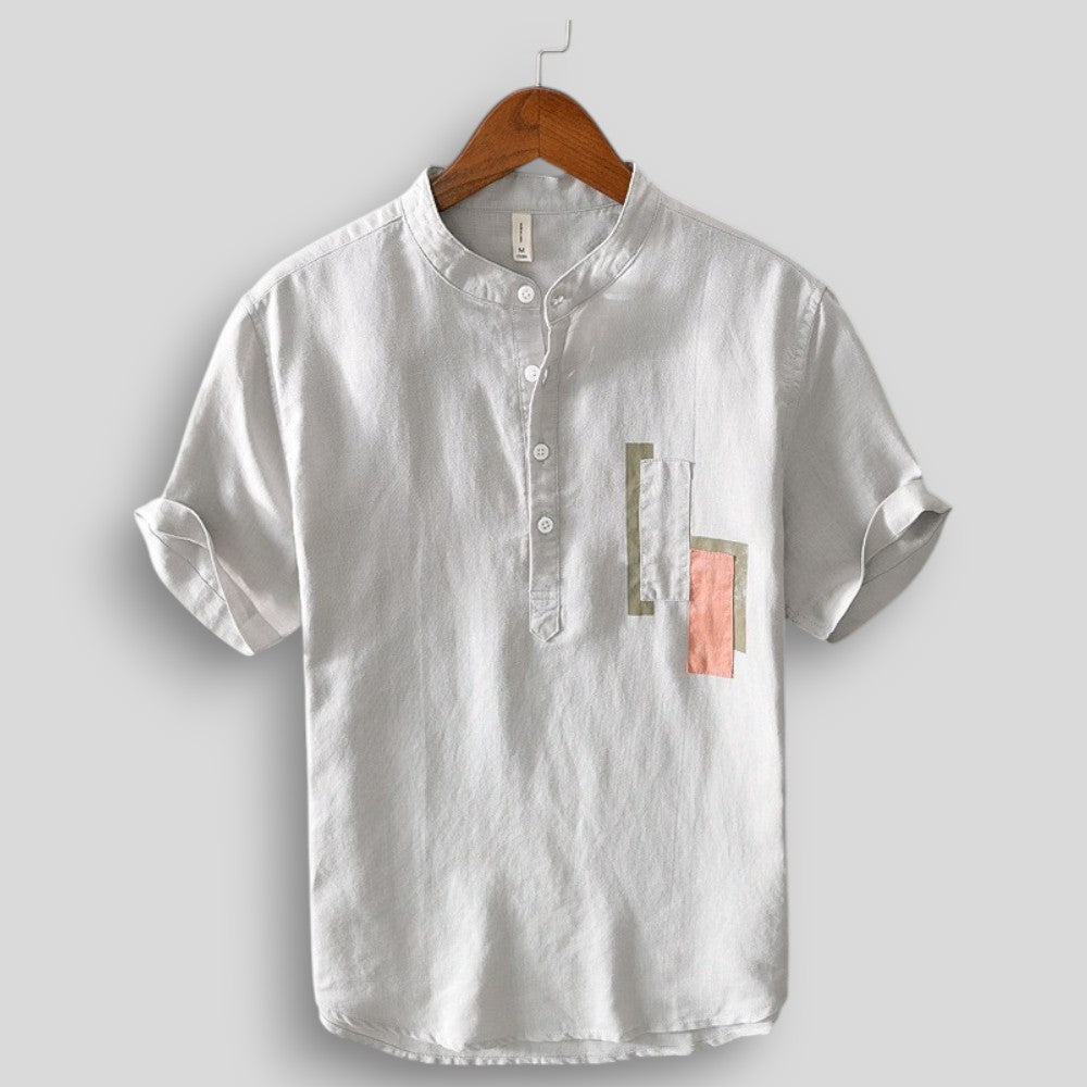 Koszulka męska z krótkim rękawem, wykonana z przewiewnej mieszanki lnu i bawełny, to świetna propozycja na cieplejsze dni. Minimalistyczny design z subtelną grafiką oraz stójka zamiast klasycznego kołnierza nadają całości nowoczesnego charakteru. Zapięcie na guziki i podwinięte rękawy podkreślają casualowy, ale dopracowany styl. Idealna do miejskich stylizacji, jak i na wakacyjny wyjazd.